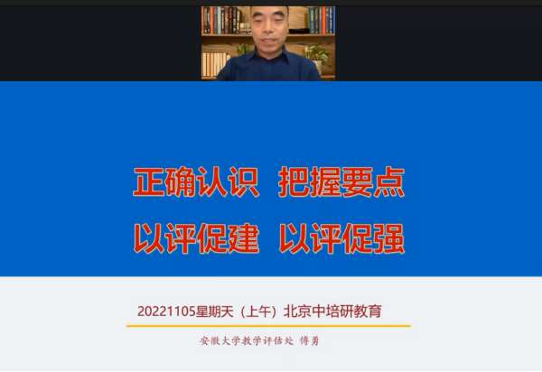 傅勇以“正确认识 把握要点 以评促建 以评促强”为主题,结合安徽大学的试点工作,讨论了在评估方案类型选择、评估方案指标选择、报告撰写等关键环节,学校和专业需要重点关注的问题。