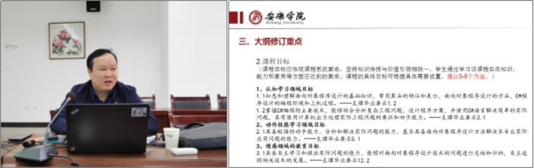 付争方从“以学生为中心”的OBE理念和工程教育认证的实质入手,讲解了基于OBE的2022版教学大纲修订目的、修订原则与框架、大纲修订重点三个方面。他强调,OBE是工程教育认证的核心理念之一,也是保障教育质量的底线要求;在人才培养方案及教学大纲修订前要明确毕业要求和培养目标的区别,以及OBE理念下人才培养目标如何进行达成评价。随后他结合2022版教学大纲模板,给教师们展示了课程简介描述、基于OBE理念的课程目标设定、教学内容与课时学时分配、课程教学主要内容与教学要求、课程考核及成绩评定、实验(实训/实践)项目信息等大纲编写关键点。