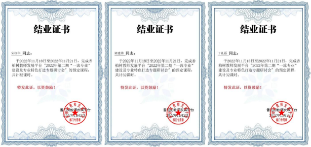 专题培训后,主办方组织了部分参会教师的线上交流研讨,并为参会教师颁发了结业证书。此次专题研讨会以专业认证和专业内涵建设为主要方向,重点关注了专业认证的实操及核心问题、专业认证的要求在课程大纲编制中的贯彻、OBE理念下的机制建设和评价改进、各个专业课程的建设要点。通过线上聆听专家报告、线上线下交流研讨,对我院两个校级一流专业建设、基于OBE理念的人才培养方案与大纲编制、课程思政建设具有重要指导意义,也将对提升我院专业内涵建设起到积极的促进作用。