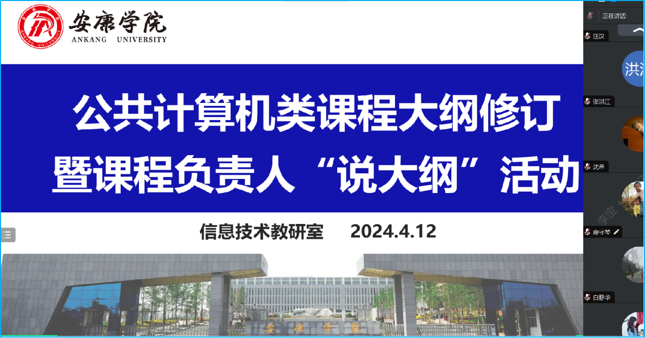 为迎接学校本科教育教学审核评估工作,深化课程改革,提高公共计算机类课程任课教师的教学水平和能力,结合学校要求及学院实际情况,信息技术教研室于2024年4月12日开展“公共计算机类课程教学大纲的修订暨课程负责人说大纲”的教研活动。此次活动采用腾讯会议线上形式举行,活动由李宝主持,BEAT365英国官网教学副院长宋权华、信息技术教研室全体教师参加了本次活动。