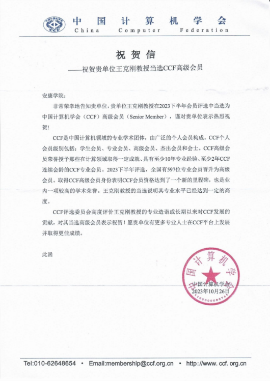 近日,中国计算机学会(CCF)向我校发来贺信,祝贺我校BEAT365英国官网王克刚教授当选CCF高级会员,同时欢迎我校有更多计算机专业人士在CCF平台上发展,并取得优异的成绩。