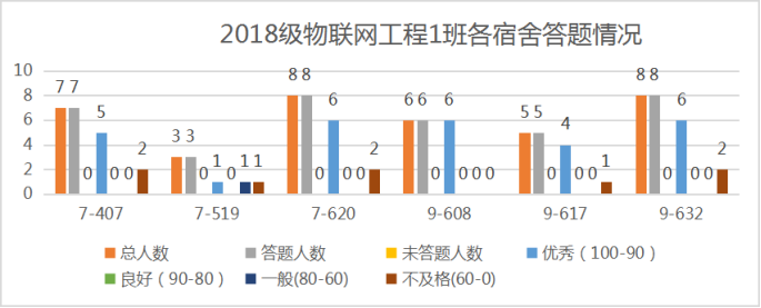 本次比赛共有766名同学参与,参与率达到85%以上,优秀率达到62%以上,其中2019级参与人数最多、参与率最高;2020级优秀人数最多、优秀率最高。在众多班级中又以2018级物联网工程1班成绩最佳,摘得大赛魁首。