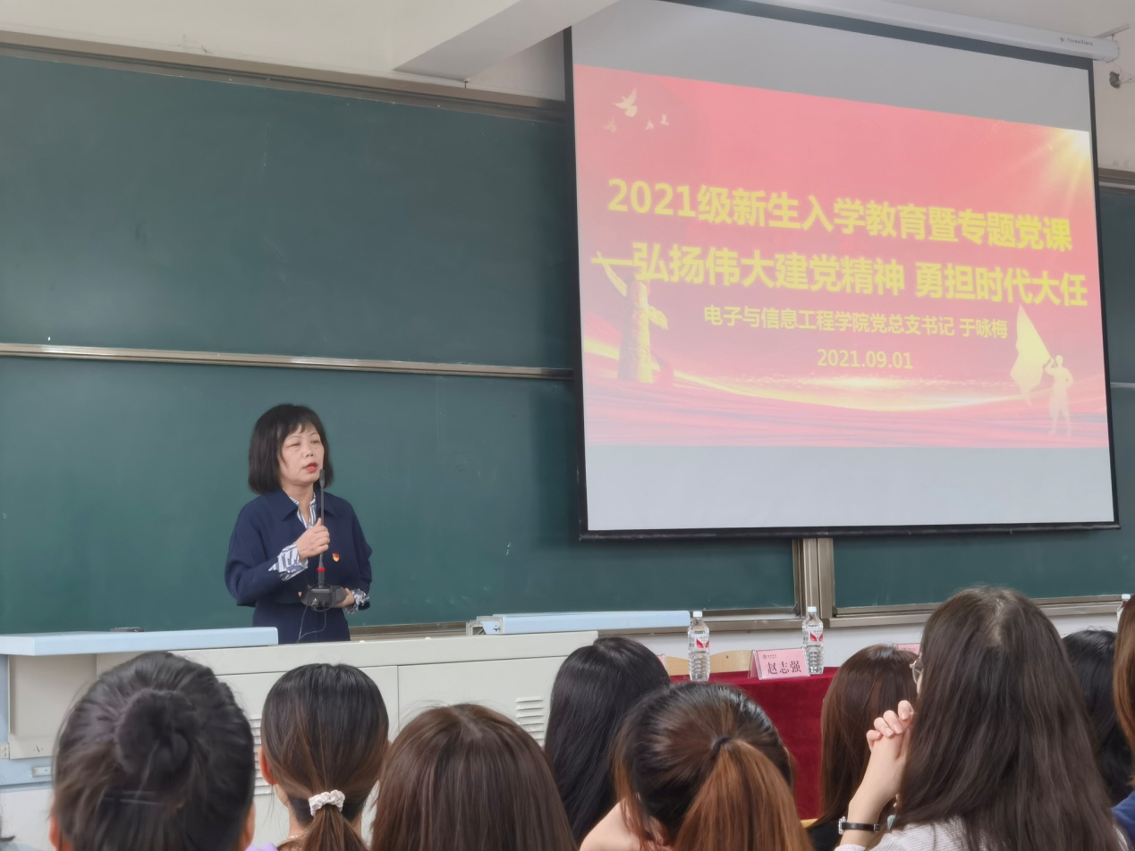 最后,党总支书记于咏梅为全体与会学生作了题为《弘扬伟大建党精神 勇担时代大任》入学教育第一讲暨专题党课。