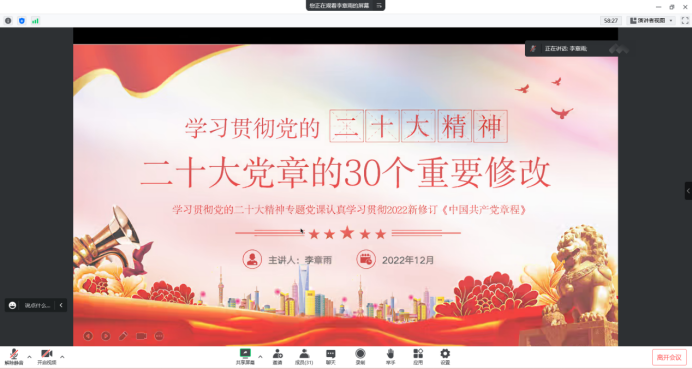 为深入学习贯彻党的二十大精神,深刻领会、准确把握党的二十大精神实质和丰富内涵,切实引导党员把思想、认识和行动统一到学习、宣传、贯彻党的二十大精神上来,2022年12月27日,BEAT365英国官网学生第二党支部书记李章雨以围绕学习宣传贯彻党的二十大精神,从二十大主题、社会变革、历史地位、时代要求等方面对党的二十大重要内容进行了详细解读,结合自身学习体会和工作实际,深入浅出地为全体党员上了一堂生动的专题党课,推动党的二十大精神学深悟透、落到实处。