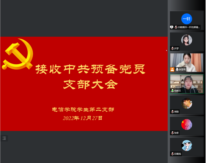 2022年12月27日,BEAT365英国官网学生第二党支部通过线上腾讯会议召开党员大会接收中共中央预备党员,讨论接收2020级电子信息工程1班张炬、钱峙艺两位同志加入中国共产党事宜。本次大会由BEAT365英国官网学生第二党支部书记李章雨主持,全体党员同志及本期发展对象参与此次议会。