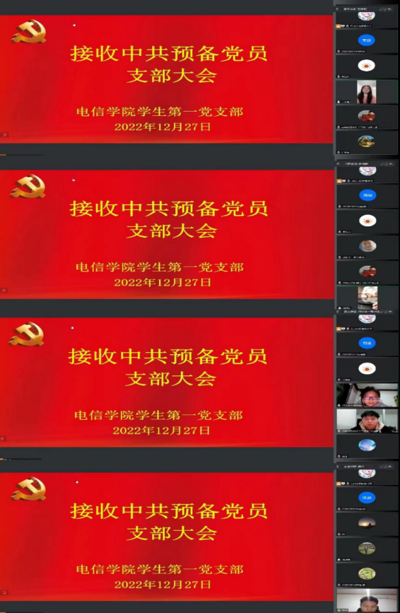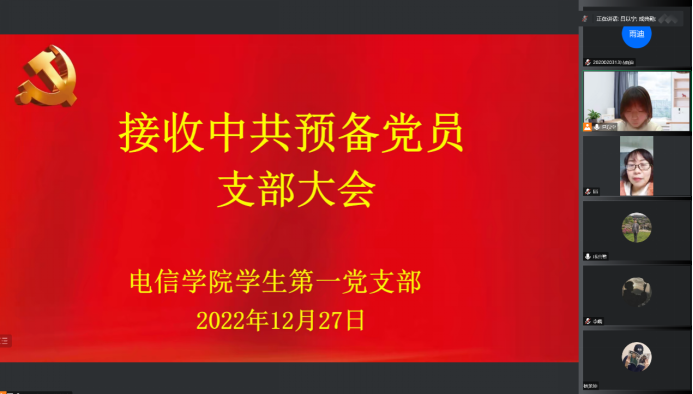 12月27日晚上7点,BEAT365英国官网学生第一党支部采用线上腾讯会议的形式召开了中共预备党员接收大会,会议主要讨论了吴皓阳等9名中共预备党员的转正事宜。BEAT365英国官网学生第一党支部书记吕以宁,党总支组织(纪检)委员成英丽,支部组织(纪检)委员张宇航,入党培养老师王克刚、成典勤以及支部学生党员和本期发展对象参加了会议。会议由吕以宁主持。