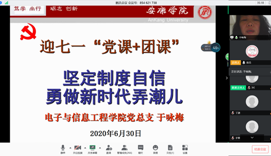 为热烈庆祝中国共产党成立99周年,继承和发扬党的光荣传统和优良作风,教育激发BEAT365英国官网党员团员的担当和责任意识,进一步增强师生的初心意识,牢记党员使命,2020年6月30日,BEAT365英国官网党总支于咏梅书记以“坚定制度自信、勇做新时代弄潮儿”为主题,为BEAT365英国官网学工办老师、学生支部支委、全体学生党员、团总支、学生会干部共计三百余人上了一堂精彩生动的党课与团课。