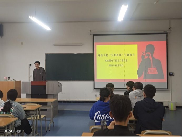 首先,班长张卓涛向参会同学讲述了本次会议的主要内容和具体形式。他讲道,本次会议主要通过图片、视频、禁烟知识讲授、戒烟经验分享、共同签署禁烟倡议书等方式向同学们宣传吸烟造成的危害和校园禁烟的意义。希望同学们能够通过此次主题班会深刻认识到了烟草对人体健康的危害,从而不仅个人远离烟草,还应该将禁烟宣传延伸到自己身边的朋友、同学及家人中去。