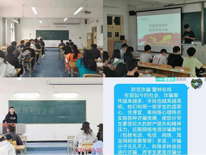 学工办主任石纭昊以讲授的形式向各班同学们讲述了如何识别防范电信诈骗的方法。手机短信内的链接都别点;凡是索要“短信验证码”的全是骗子;凡是无显示号码来电的全是骗子;闭口不谈卡号和密码;不信“接的”,相信“打的”等等。并且列举了多起大学生受骗案例,增强同学们的灵活应对能力,提高同学们自我预防及自我保护意识。接着,给同学们介绍了上当后的补救措施,如拨打95516请求帮助与及时拨打110报警等。石纭昊希望学生们在专业学习之余,应自觉尝试接触社会,增加自身的社会经验,加强自己的社会适应能力,同时重视安全教育,提高自身的安全防范意识,对不清楚的事宜及时与学校老师沟通咨询。增强自身的心理素质,树立好正确的价值观和金钱观,一旦出现意外,沉着冷静,注意调整好自己的心态,随时与父母和老师沟通。