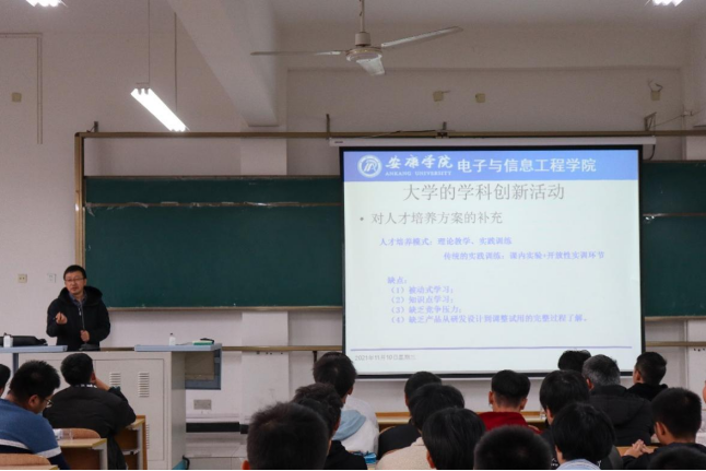 首先,王克刚向在场同学讲述了大学生科技创新的活动的内涵。大学生科技创新活动的本质是一种创新实践活动,其内涵随着时代的进步和实践的发展而不断发生变化,具有与时俱进的理论品质。在我国,大学生科技创新活动随着高等教育的改革与发展以及经济社会的进步而不断发展壮大,随着大学的价值在知识经济时代的凸现,大学生科技创新活动的内涵也得到了全面拓展。王克刚指出大学的学科竞赛主要有四大优点。第一,学科竞赛中的内容十分丰富、范围十分广泛,学生不仅需要对某方面的专业课程知识进行应用,而且需要将所学的全部专业知识进行融合,进一步对所学知识进行提炼,实现举一反三,达到扩大知识面的目的。第二,参加学科竞赛,获得了较好成绩的学生可以增加自信心,从而转化为学习动力,最终能够带动更多的学生参与到学科竞赛中。第三,学生参加学科竞赛,资料查阅、作品分析、独立完成创意和设计的过程中,不仅可以培养强大的动手能力,还可以锻炼自己清晰的语言表达能力和高效的组织能力。第四,在学科竞赛中获得一定的成绩是对学生综合能力和综合素质的肯定,甚至被认为和工作经验同样重要,在比赛中获得了奖项的学生在就业中更会受到招聘单位的青睐,竞争力明显增强。