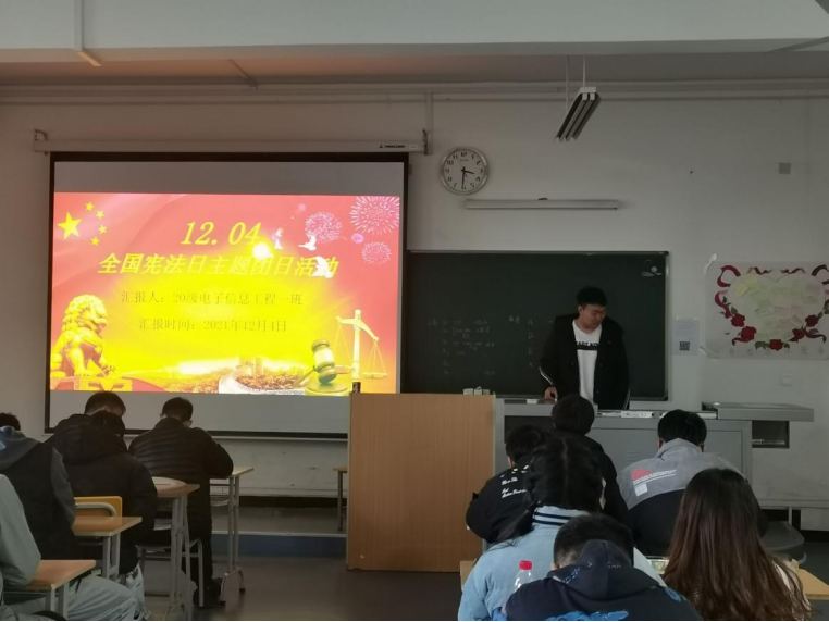 活动伊始,2020级电子信息工程1班团支书宋齐伟给同学们科普了宪法的形成过程,使大家了解认识到了我国宪法在保持稳定性和权威性的基础上紧跟时代前进步伐,不断与时俱进。让大家知道“国家宪法日”不仅是一个重要的仪式和纪念日,更需要的是传递依宪治国、依宪执政的理念,形成举国上下尊重宪法、宪法至上、用宪法维护人民权益的社会氛围。