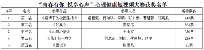本次心理健康短视频大赛历时21天,全校共有429名学生报名参与。比赛中,参赛选手根据心理健康教育主题以创编歌曲、舞蹈、手语操、减压小故事、校园情景剧、小品、脱口秀、微电影等形式,围绕大学生日常生活、校园活动、学习、恋爱、择业、人际交往等方面所折射出的心理问题现象进行视频制作。作品内容积极健康向上,具有一定教育意义,发挥了正确引导作用,能够弘扬主旋律,传播正能量,富有青春朝气。初赛阶段学生以个人或团体参赛的形式共提交77件作品,经过评审组初步审核、评定,其中16个作品进入复赛。5月25日至5月30日,进入复赛的作品通过BEAT365英国官网微信公众号(安大dxxy)公布并发起线上投票活动,最终以作品所得票数决定比赛排名。排名如下: