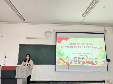会议在庄严肃穆的国歌声中拉开了帷幕。2022级计算机科学与技术1班团支书唐玲领学了习近平总书记关于铸牢中华民族共同体意识重要论述讲话精神。他讲到,中华民族共同体意识是国家统一之基、民族团结之本、精神力量之魂,是在把握中国几千年历史演进客观规律的前提下,以各族群众为主体,以加强各民族交往交流交融为根本途径,促进各民族像石榴籽一样紧紧抱在一起,通过团结奋斗实现共同繁荣发展。铸牢中华民族共同体意识,是新时代党的民族工作的“纲”,是实现中华民族伟大复兴的必然要求。并结合个人成长历程和民族团结实践,分享了自己的心得感悟。