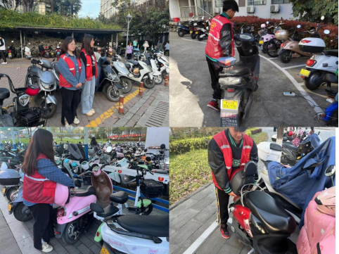 志愿者身着红马甲,对电动车、摩托车、自行车乱停乱放、占用校园绿地、消防通道、人行道等公共区域,以及占用机动车停车泊位现象进行劝导和整理,将不规范停放的自行车为和电动车统一调整至已施画的非机动停车点位,并将车头统一按泊位内箭头方向停放。