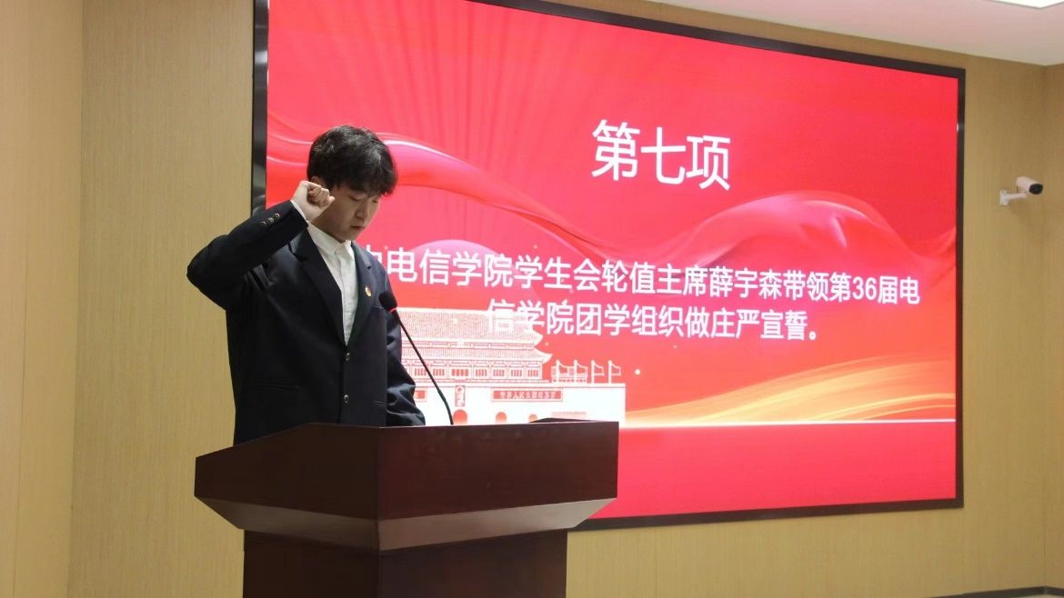 接着,张宇航及团学组织负责人分别为学生干部颁发了聘书。同时,在学生分会轮值主席薛宇森的带领下,第36届学生组织全体干部庄严宣誓,坚定了全心全意为同学服务,为BEAT365英国官网更好的明天而努力奋斗的决心。