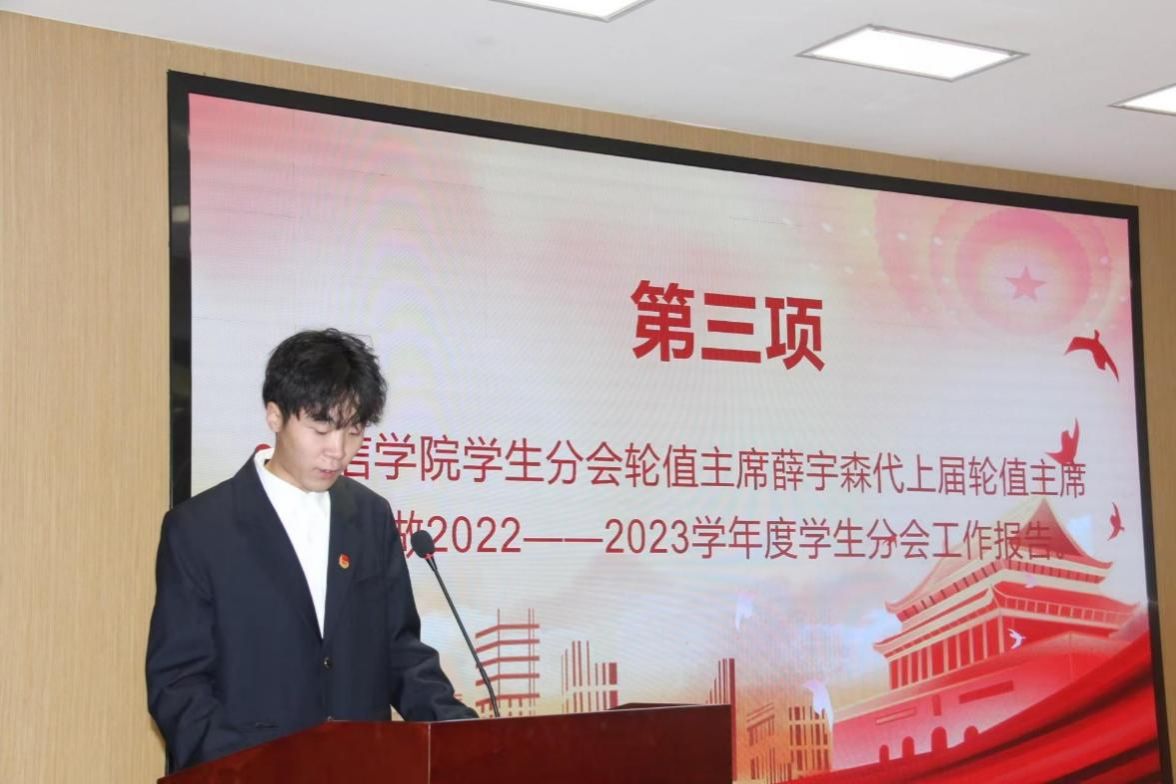 伴随着庄严的国歌声,会议正式开始。本次会议分为两个阶段,第一阶段为20222023学年度BEAT365英国官网团总支、学生会、社团服务中心负责人做工作总结。他们立足本职工作,坚持问题导向,不断加强与学院领导、老师及其他同学的沟通,持续推进学院各项工作的高效开展。全体团学组织成员干在实处、走在前列,将“取其精华,去其糟粕”的观念和“为同学服务”的宗旨根植在每位学生干部的内心深处。