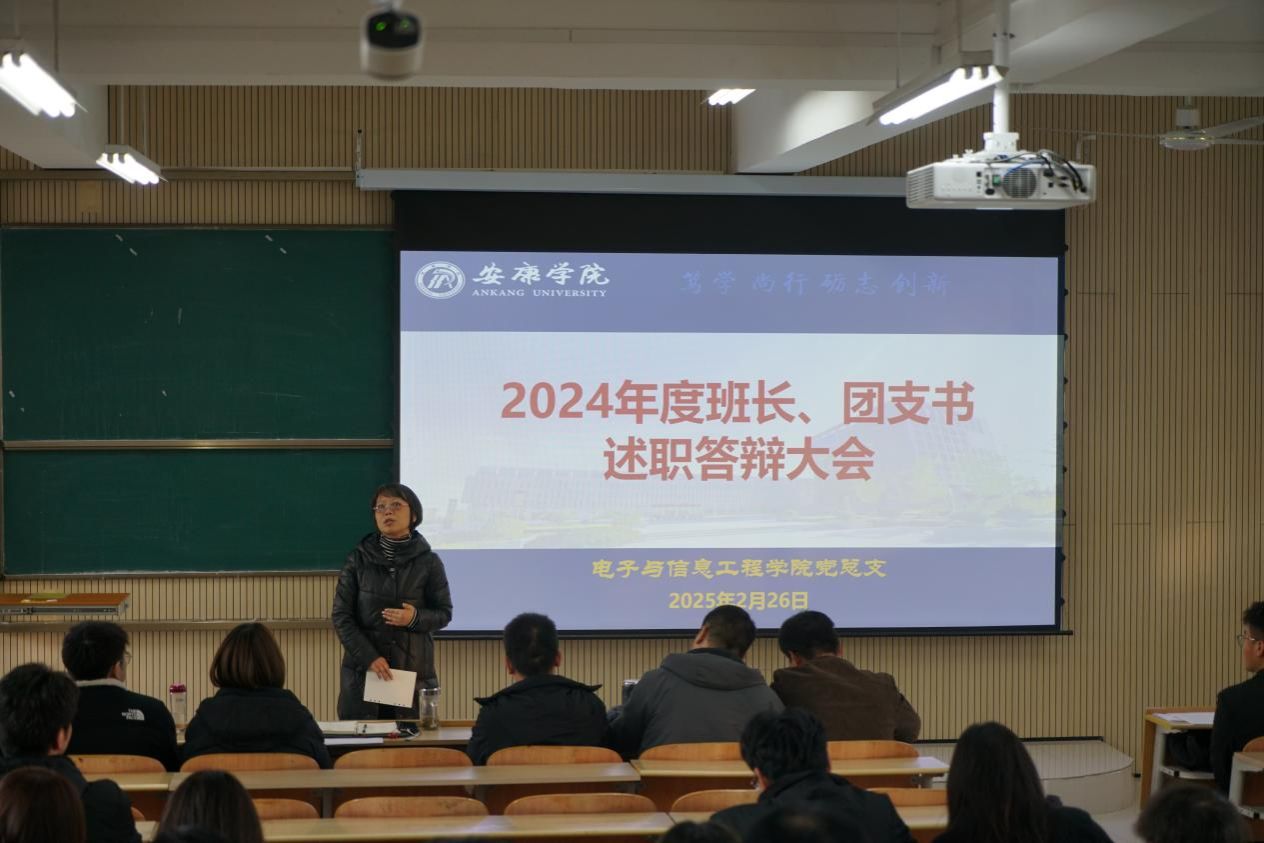 BEAT365英国官网围绕学校“五位一体”思想政治工作大格局总体部署,全面落实大学生思想政治工作“八大工程”具体要求,强化班团干部队伍建设,推进优良班风、学风建设,助力学生成长成才,打通“十大育人”体系的最后一公里。2月26日下午2点,BEAT365英国官网于1323 教室召开了以 “聚焦班团一体 助力学生成长” 为主题的2024年度班长、团支书述职答辩会。学院党总支书记于咏梅,党总支副书记蔡正旺,学工(就业)办主任石纭昊,团总支书记(创新创业工作办公室主任)张宇航,辅导员成英丽、翟子轩、吕以宁、贾金兵,以及 2022 级、2023 级、2024级班团干部,团总支、学生会部长等60余名学生参与会议。本次会议由团总支副书记李子涵主持。