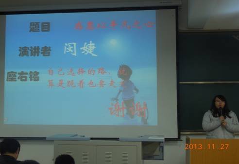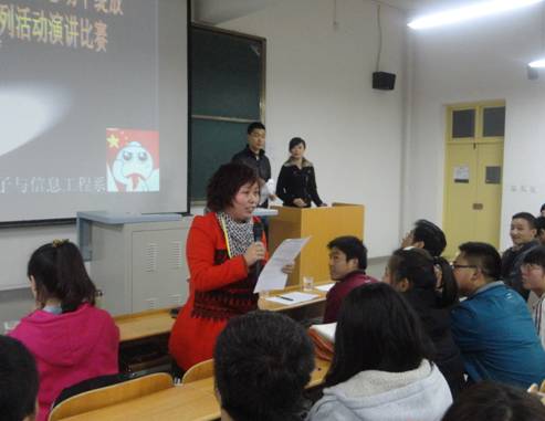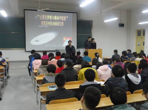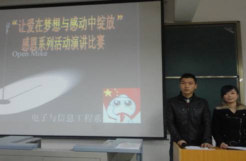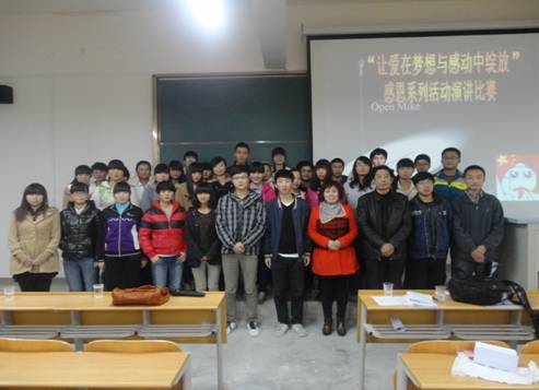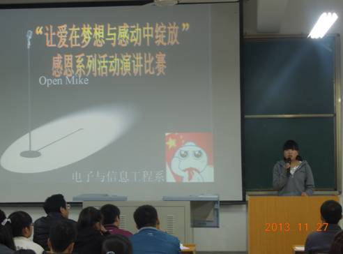 2013年11月27日晚,电子信息工程系团总支在 1号教楼1305室举行“让爱在梦想与感动中绽放”演讲赛决赛,辅导员成英丽,王贵新及2013级新生参加。