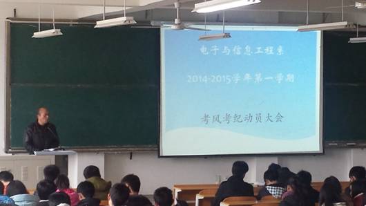 2015年1月8日,电子与信息工程系在1301教室召开期末考试考风考纪动员大会,大会由学生办公室副主任石纭昊主持。