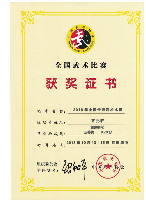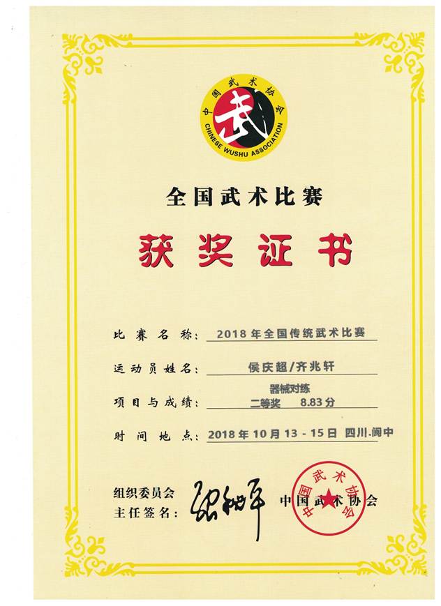 我院2015级电子信息工程专业学生齐兆轩在2018年四川阆中全国传统武术比赛获得佳绩。