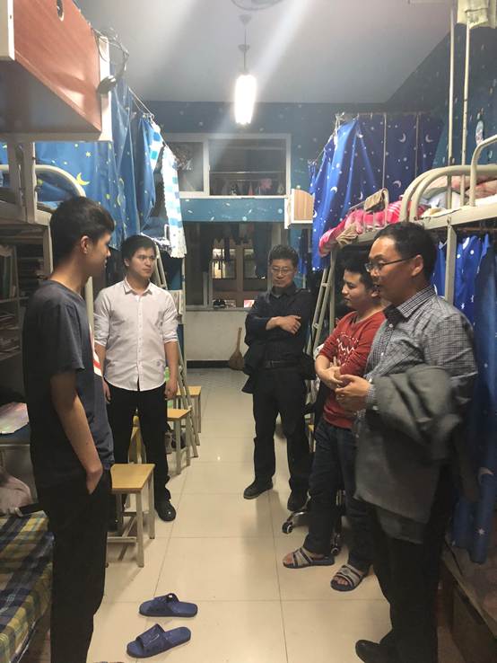 晚上院长陈守满,党总支书记何道利,学工办全体辅导员深入学生宿舍就宿舍卫生和安全进行指导和排查。