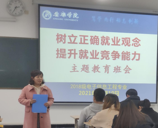 为进一步引导毕业生树立正确的择业观与就业观,认清就业形势、把握就业机会,2021年12月10日,电子与信息工程学院在江北校区1308教室召开了以“树立正确就业观念,提升就业竞争能力”为主题的毕业班就业教育主题班会,班会由辅导员成英丽老师主持,全体电子与信息工程专业同学参加。