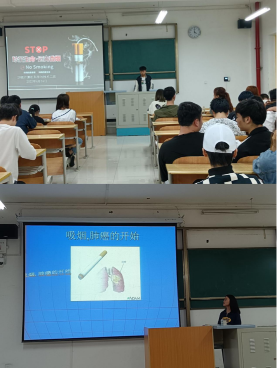 2022年是爱国卫生运动开展的第70周年,4月也是第34个爱国卫生月,为弘扬健康向上、清洁无烟的和谐校园,电信积极开展“无烟校园”班会活动。班会从实际案例出发,为同学们讲解了烟草及电子烟对同学们的身心健康成长的危害性,烟草中均含有可导致人体发生多种致死性和致残性健康问题的毒素,尤其是肺癌、心脏病、肺气肿及其他致死疾病的危险性明显增加,并向同学们普及控烟禁烟法律、二手烟的危害等,以此提高同学们健康防护意识、遵纪守法意识,呼吁同学们打造良好舒适的校园环境,建设无烟校园。无烟校园建设是有效降低人群吸烟率、减少烟草危害的重要措施,对于营造健康文明育人环境、保护广大青年身心健康、促进青年养成良好行为习惯具有十分重要的意义。