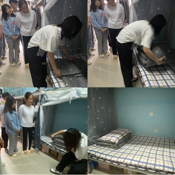 紧接着,退伍士兵韦婕到达指定的女生宿舍5-222进行整理示范,其他宿舍派一名负责人到该宿舍进行参观并且学习。韦婕从暖壶、水杯的摆放位置,毛巾的叠挂,重点是卧具的叠放整理做了详细的讲解。随后,每个同学按照要求,在15分钟内整理好自己的物品。整理过程中,各位同学有条不紊、分工明确,按照要求整理宿舍。