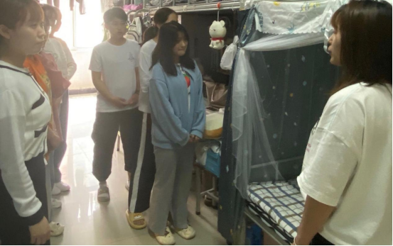 最后,辅导员李章雨陪同退伍士兵对其他宿舍的内务整理检查,所有宿舍的环境卫生、内务整理焕然一新,学生的卧具摆放整齐划一。