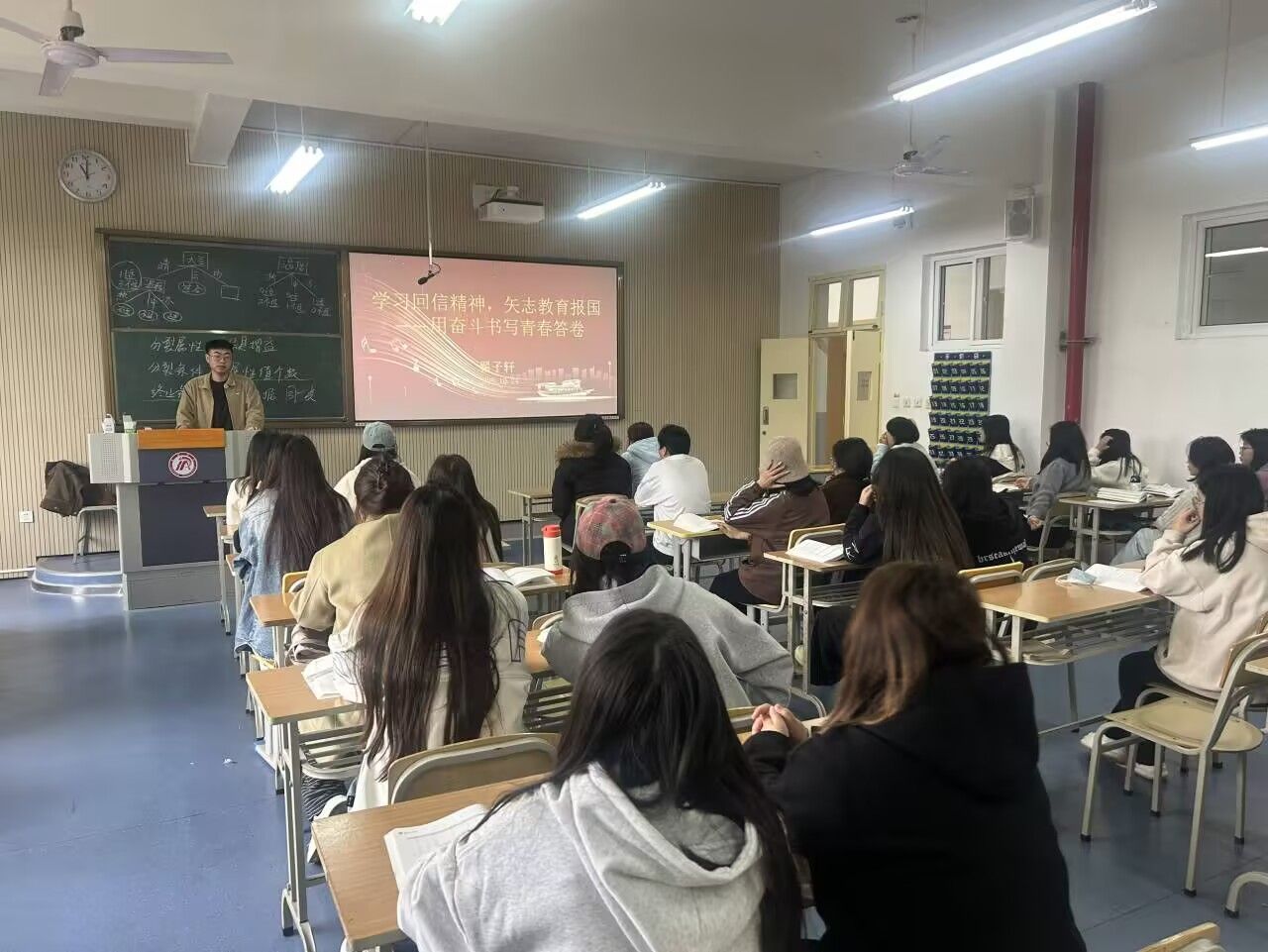 班会上,辅导员以“学习回信精神”为核心,以“树立优良学风”为落脚点,首先带领学生逐字逐句学习习近平总书记给特岗教师的重要回信原文,深入解读回信的核心要义与时代价值,引导学生深刻认识教育事业的重要意义,增强投身教育事业的责任感与使命感。随后,结合国家乡村振兴战略与教育家精神,辅导员向学生们介绍了乡村教育发展现状,鼓励大家树立“下得去、留得住、教得好”的基层从教信念,主动将个人发展和基层教育需求相结合,积极投身基层教育事业。