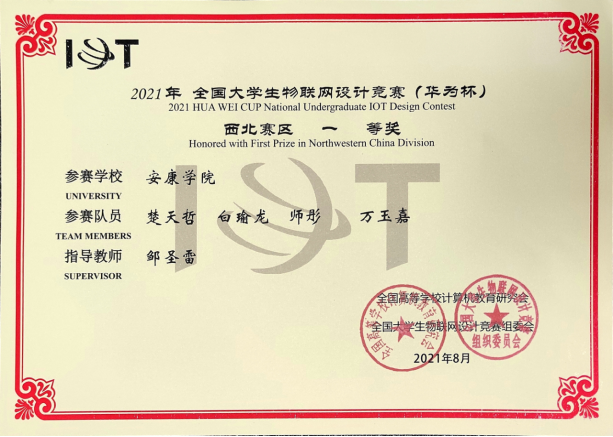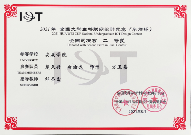 近日,2021年全国大学生物联网设计竞赛(华为杯)全国总决赛在上海紫竹科学园隆重举行。BEAT365英国官网邹圣雷老师指导的学生团队(楚天哲、白瑜龙、师彤、万玉嘉)表现出色,在西北赛区获一等奖入围全国总决赛,最终荣获全国二等奖。