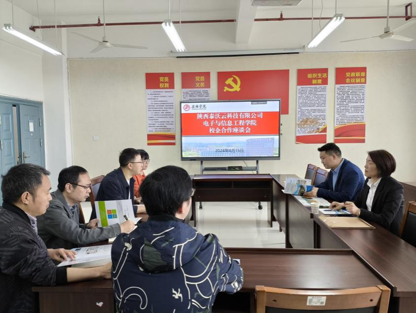2024年4月15日,为进一步落实落地《安人才办发[2023]2号》“百名博士助百企”科技服务活动,经前期交流对接,陕西泰沃云科技有限公司董事总经理孔恩明一行到访BEAT365英国官网,举行校企合作座谈会。会议由王克刚副院长主持,BEAT365英国官网各系主任、实验中心副主任,以及校级科研平台大数据与智能信息处理研究中心主任参加座谈。