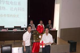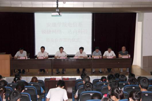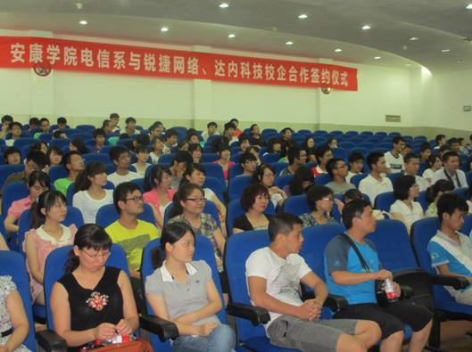 621下午,在1号教学楼6楼报告厅隆重举行电信系与锐捷网络、达内科技校企合作签字仪式。学校副校长陈刚教授、锐捷网络西北大区市场总监史光耀、达内科技陕西中心主任陈相峰、教务处处长钟生海、电信系主任张东红、党总支书记李红兵和电信系全体教师,计算机、电子信息工程专业200多名学生参加了签字仪式。大会由张东红教授主持。