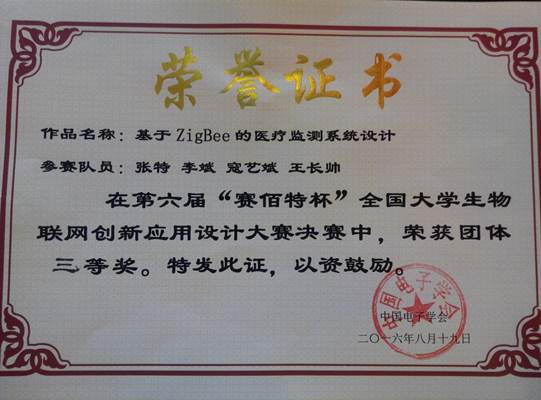 2016第六届“丰台科技园·赛佰特杯”全国大学生物联网创新应用设计大赛决赛于2016年8月19日在北京大红门国际会展中心落幕,电子信息工程学院2013级电子信息工程专业张特、李斌、王长帅、寇艺斌同学设计的作品《基于ZigBee的医疗监测系统设计》荣获全国总决赛三等奖。