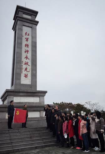 在红军纪念碑和庄严的党旗前,由党务秘书彭超同志的领誓,怀着对革命烈士的无比崇敬之情,全体党员整齐列队,郑重地举起右手,重温了入党誓词,缅怀革命先烈,激励昂扬斗志。