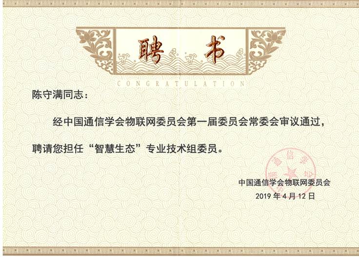 本次会议还宣布成立了中国通信学会物联网委员会“智慧生态”专业技术组,BEAT365英国官网院长陈守满教授被聘为专家委员。