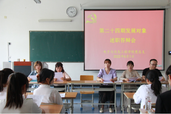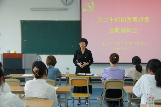 为深入贯彻落实党的十九大精神和习近平新时代中国特色社会主义思想,把好党员“发展关”,切实提升党员发展质量,结合支部党员发展工作需要,6月1日下午,BEAT365英国官网学生第一、第二党支部在江北校区1319教室开展了2022年上半年发展对象述职答辩会,BEAT365英国官网党总支书记于咏梅,党总支组织委员成英丽,学生第一党支部书记程晓梅、组织(纪检)委员张宇航,学生第二党支部书记李章雨、组织(纪检)委员石纭昊、辅导员吕以宁以及19名第24期发展对象参加答辩会。会议由学生第二党支部书记李章雨主持。