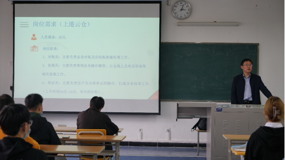 会议伊始,运营经理张凡为在场的同学放映了安康“无水港”的宣传片,展示了其服务平台,随后以PPT的形式从岗位要求、岗位职责、岗位待遇、应聘方式四个方面向同学们做了介绍,使其全面的了解到安康上港物流有限公司对员工的要求。最后,张经理通过自主提问的方式回答了学生有关于“薪酬待遇”“培训周期”“今后发展地区”等问题,并诚挚邀请同学们加入安康上港有限公司。