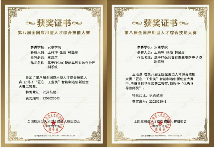 本届大赛设置“匠心•民族魂”平面设计大赛、“匠心•工业美”智能制造创新创意大赛、“匠心•职场秀”简历精英挑战大赛、“匠心•青春梦”大学生职场装创意设计大赛、及教师组的“匠心•园丁情”教师创课大赛、“匠心•园丁情”辅导员职业能力大赛共6个参赛科目,共有来自全国896所院校、12578支队伍报名参赛。竞赛采用参赛队线上答辩、专家线上混合评审的方式进行,参加评审的评委均为来自行业著名企业和高校相关领域的专家。参赛项目历经答辩、实物演示以及专家质询三个环节,我院两组参赛团队最终荣获“匠心•工业美”智能制造创新创意大赛一等奖和二等奖,指导老师崔智军和王泓淇分别被授予“优秀指导教师奖”。