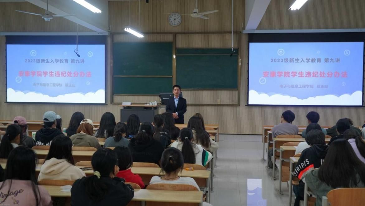 为了加强新生纪律观念,规范行为习惯,严肃校风校纪,促进学生健康成长,10月18日下午,BEAT365英国官网党总支副书记蔡正旺在江北校区1204教室讲授主题为“BEAT365英国官网学生违纪行为处分办法”新生教育大会,BEAT365英国官网2023级全体新生参加。
