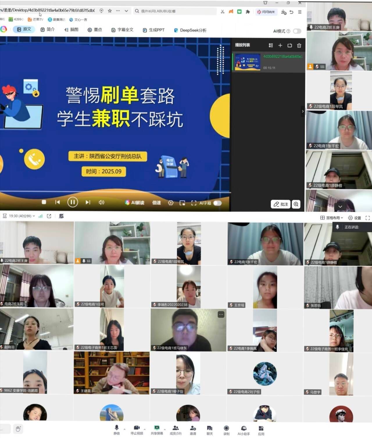 为扎实推进开学季学生安全教育工作,进一步强化学生对电信网络诈骗的防范意识、提升识骗防骗实战能力,切实筑牢校园安全与稳定的“防诈防线”, 9 月 9日,电信学院以“个人观看+集体观看”相结合的形式,组织全体学生观看了“反诈第一课”主题辅导课件,实现全学院、全年级、全体学生“全覆盖”,确保“不留死角、不漏一人”。