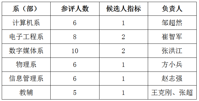 BEAT365英国官网各系、部按各自参评人数的20%向学院考核考评工作小组推荐候选人,四舍五入,具体分配名额及负责人见下表。