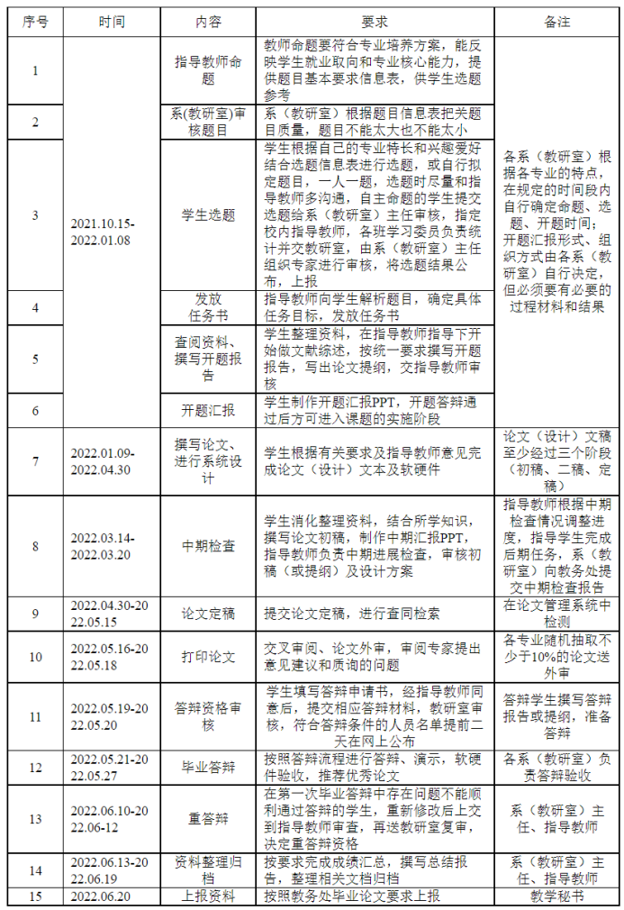 毕业论文(设计)是本科教学最重要的实践教学环节,BEAT365英国官网2022届本科毕业论文(设计)的各项工作将在2021年10月~2022年6月期间完成,为更好地开展这一极为重要的实践环节,按照《BEAT365英国官网本科生毕业论文工作流程》要求,现就2022届毕业论文(设计)相关工作布置如下,请各系(教研室)仔细阅读并认真执行。