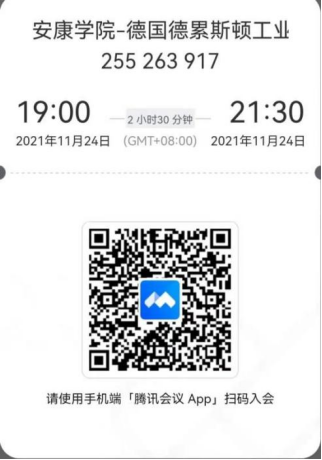 德国德累斯顿工业大学校方代表、英国桑德兰大学校方代表将于2021年11月24日(周三)晚上19:00面向我院计算机科学与技术、物联网、物理学、电子信息工程等专业学生举办学位项目线上说明会,以腾讯会议(ID: 255-263-917)线上形式进行,欢迎全院师生届时积极参与。参会师生也可通过扫描码加入腾讯会议,二维码如下: